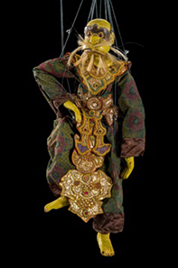 Le marionette birmane yokthe-pwe in legno con inserimenti in metallo presentano una fattura accurata; tra queste uno splendido Hanuman – generale dell’esercito delle scimmie del Ramayana – le cui ricche vesti ricordano i fasti degli abiti tradizionali di corte.