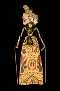 I burattini di legno e stoffa wayang golek, di antica tradizione giavanese, vengono manovrati dal basso con un’asta centrale che attraversa tutto il corpo fino alla testa, mentre aste laterali collegate alle mani permettono il movimento delle braccia.